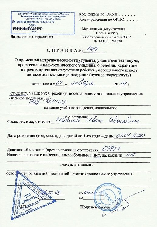 Бланк обязательно должен быть заверен печатью доктора, штампом поликлиник, визой специалиста. Он укажет срок болезни, режим лечения, дату, с которой можно приступать к занятиям.